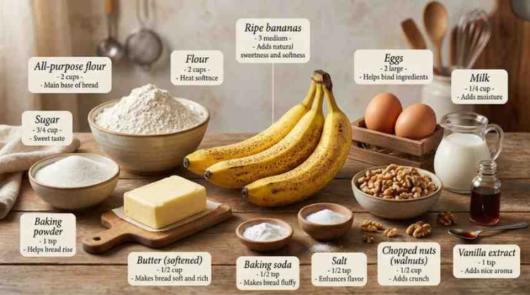 | Baking soda | 1/2 tsp | Makes bread fluffy |
