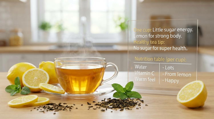 One cup: Little sugar energy. Lemon for strong body. Healthy tea tip: No sugar for super health.