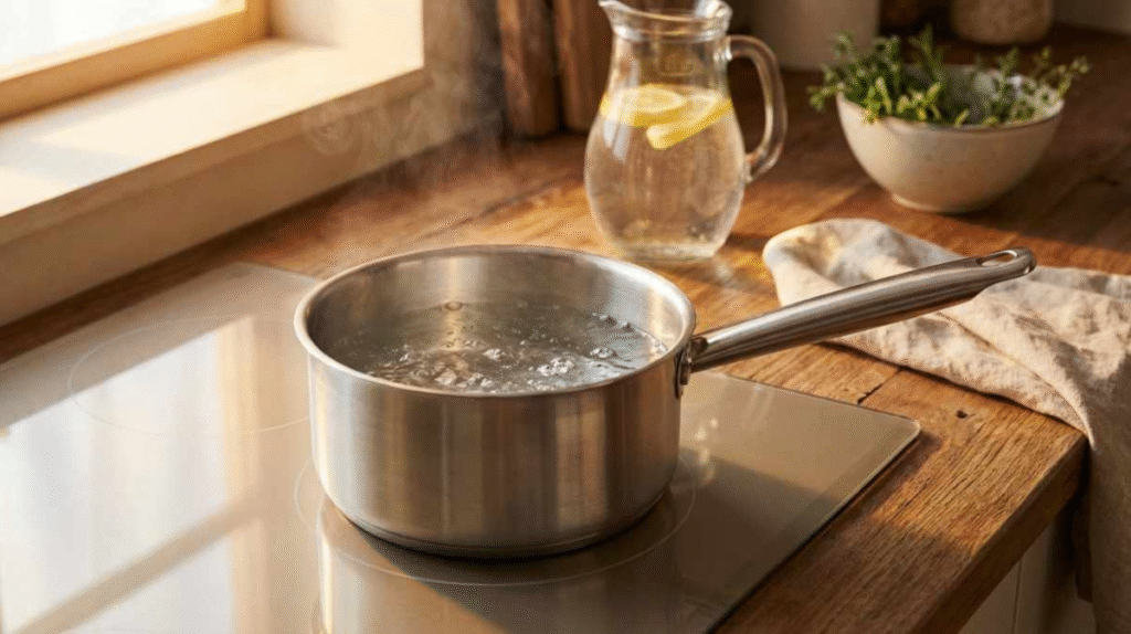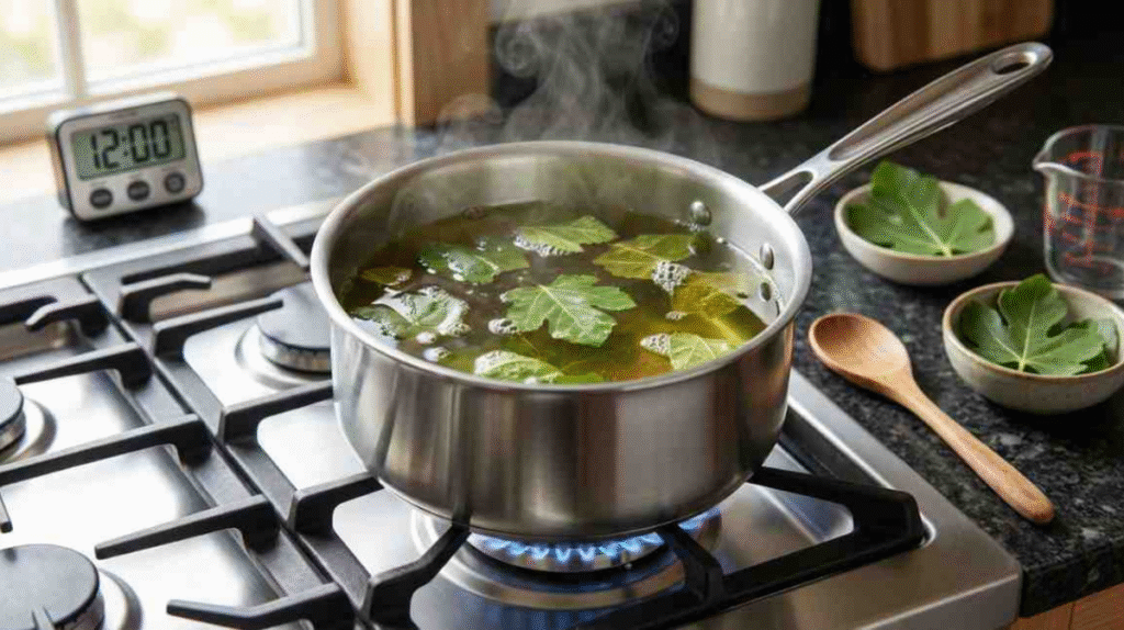 Add the fig leaf pieces to the boiling water. Reduce heat and let it simmer for 10–15 minutes. This step allows the leaves to infuse properly.