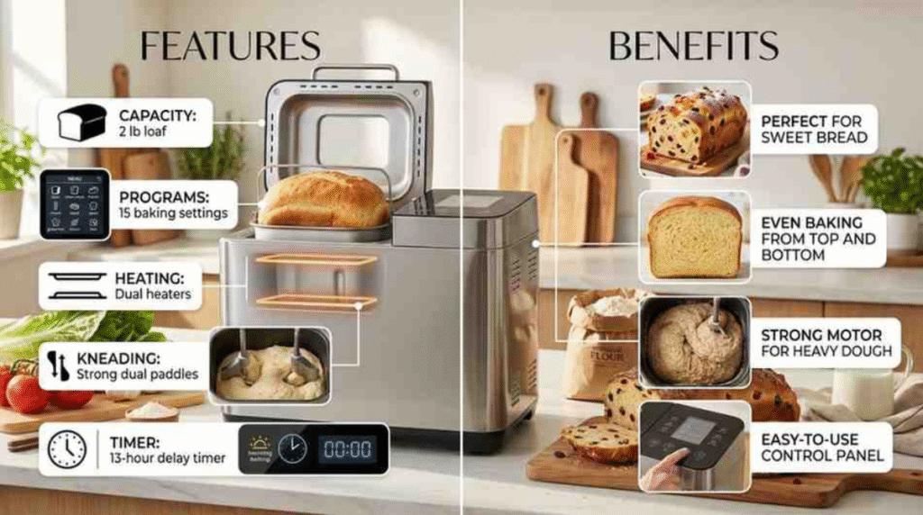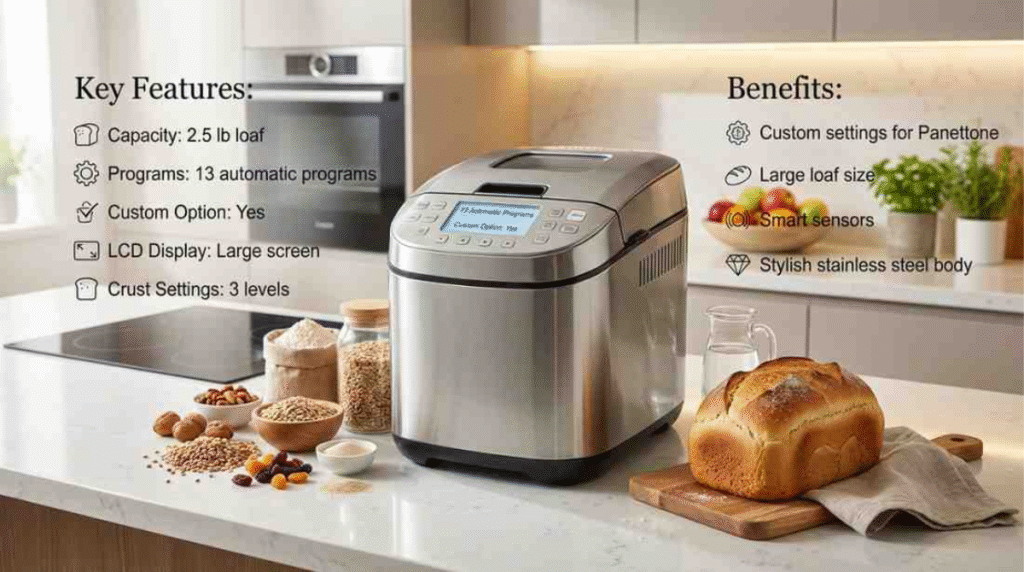 Top 3 Panettone Bread Makers featuring large capacity models, artisan settings, stainless steel design, and premium build quality displayed on a modern kitchen counter with fresh panettone bread.
